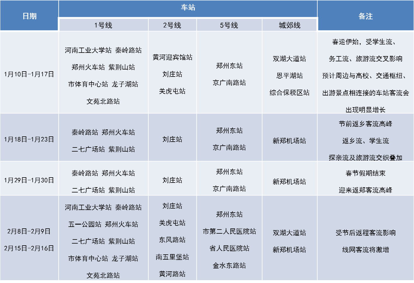 2020年春運從1月10日(臘月十六)開始,到2月18日(正月廿五)結束,共計40天。鄭州地鐵合理調配運力,全力做好春運服務保障各項工作,保障乘客平安、順利回家。